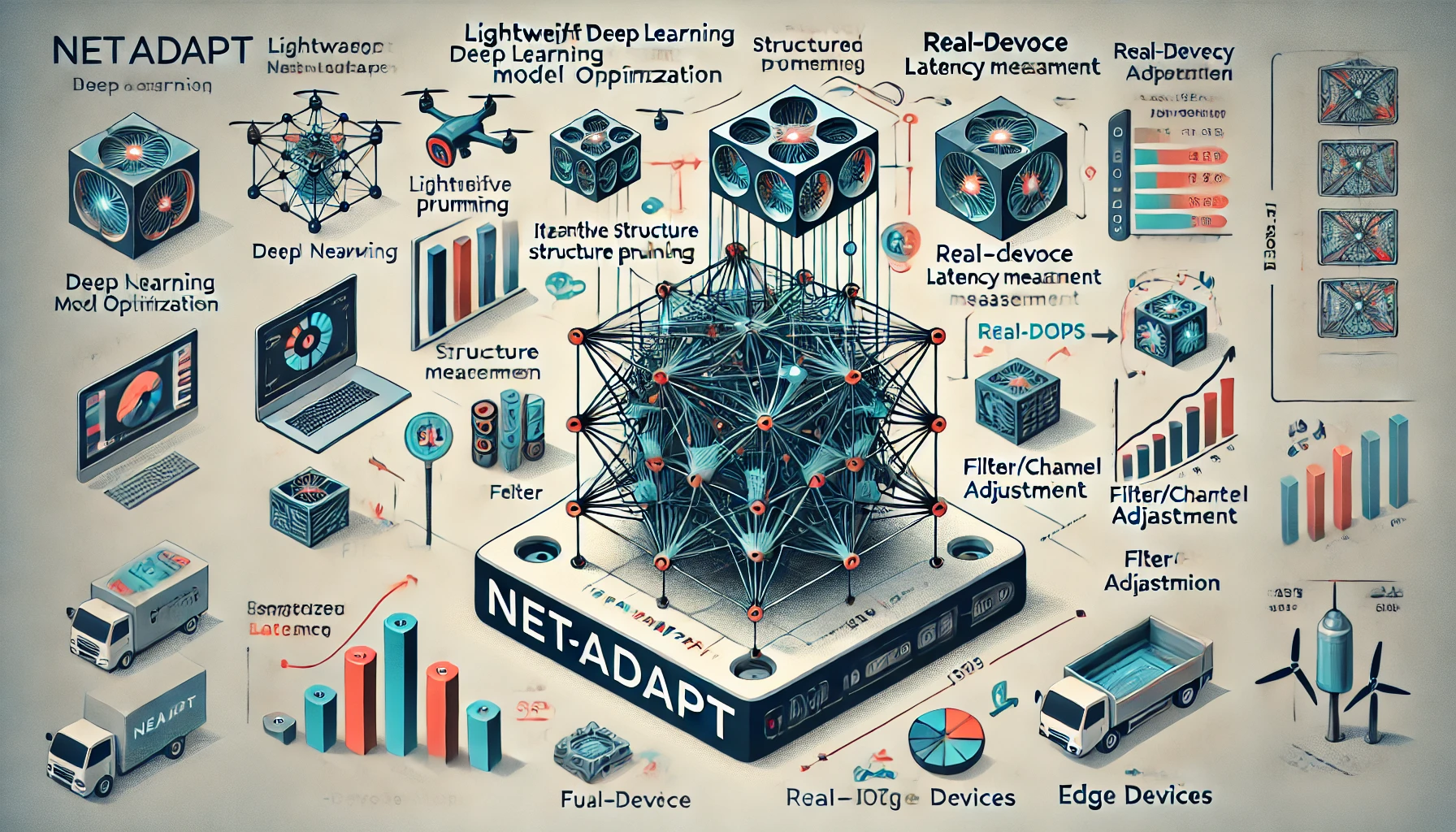 NetAdapt(넷어댑트)는 주어진 하드웨어 성능 제약(예: 연산량, 지연시간, 메모리 크기)에 맞춰 자동으로 최적의 딥러닝 모델 구조를 찾아주는 경량화 알고리즘입니다. 기존의 고정된 네트워크 구조를 사용하는 것이 아니라, 성능 손실을 최소화하면서 하드웨어 자원에 최적화된 경량 모델을 자동 탐색하여, 실제 환경에서 추론 효율을 극대화하는 것이 핵심입니다.