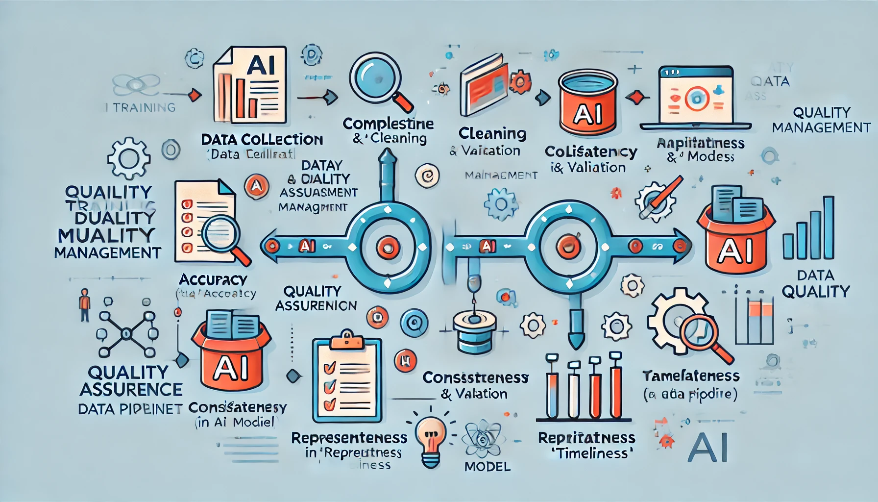 AI 학습용 데이터 품질관리 체계란 AI 모델 학습에 사용되는 데이터셋의 전체 생애주기에서 품질을 확보·관리하기 위한 정책, 프로세스, 도구, 평가 기준 등의 총체적 시스템을 의미합니다. 이는 단순한 데이터 정제 작업을 넘어서, 데이터 확보 → 전처리 → 검수 → 평가 → 모니터링까지의 전 과정을 포함합니다.