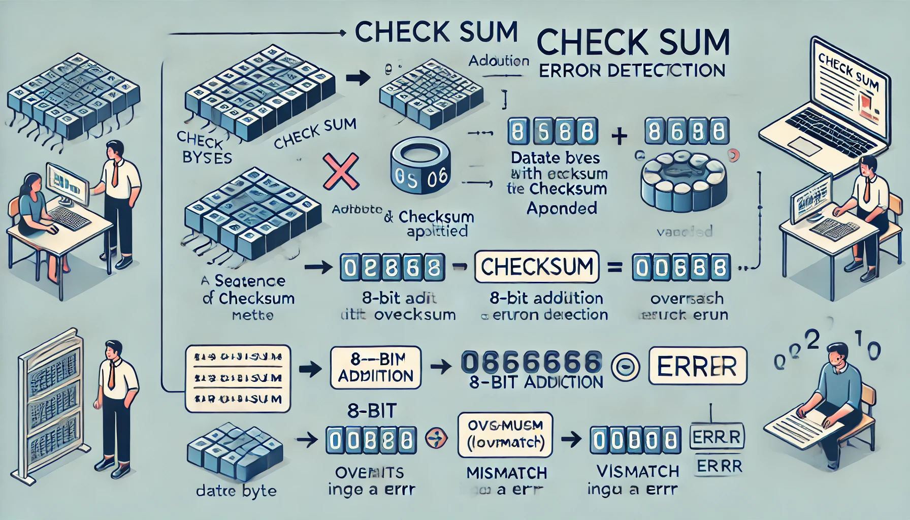 체크섬은 전송할 데이터의 일정한 단위(예: 바이트 또는 워드)를 합산하여 나온 값을 데이터 끝에 첨부하고, 수신 측에서 동일한 계산을 통해 데이터의 무결성을 확인하는 방식입니다.