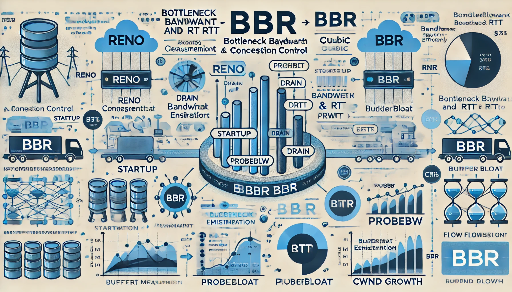 **BBR(Bottleneck Bandwidth and RTT)**는 패킷 손실이 아닌 대역폭(BtlBw)과 최소 RTT(RTprop)를 측정하여 혼잡 윈도우(CWND)를 조절하는 방식의 TCP 전송 제어 알고리즘입니다.