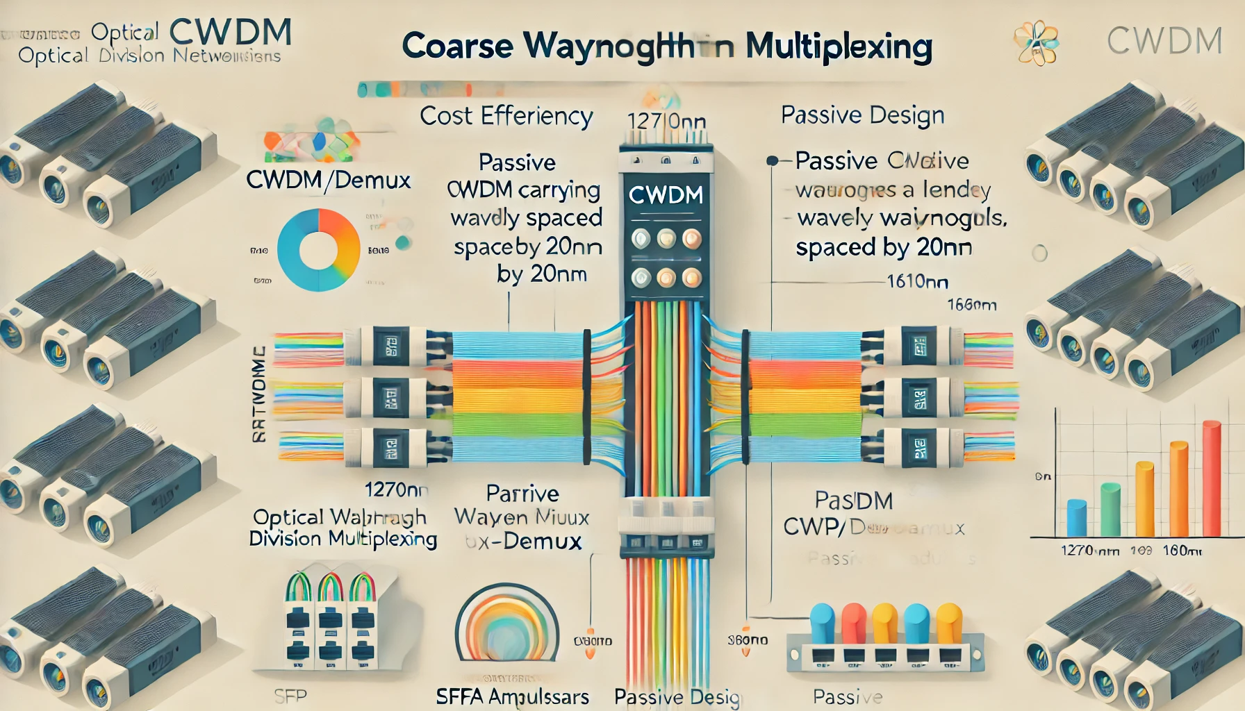 CWDM은 파장 간 간격이 약 20nm로 설정된 광 다중화 기술로, 1270nm~1610nm 범위에서 최대 18개 채널을 하나의 광섬유로 동시에 전송할 수 있다. 복잡한 냉각 장치나 증폭기 없이도 운용 가능하며, 경제적인 구축이 가능한 것이 큰 장점이다.