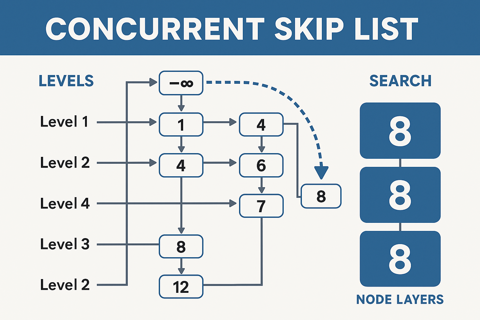 Concurrent Skip List는 Skip List의 계층적 링크 구조를 락-프리 또는 락-경량 방식으로 확장한 구조입니다. Skip List는 기본적으로 여러 레벨의 링크드 리스트를 중첩해 탐색 속도를 높이는 자료구조로, Concurrent 버전은 노드 삽입/삭제 시 다른 스레드와 충돌 없이 동작할 수 있도록 설계됩니다.