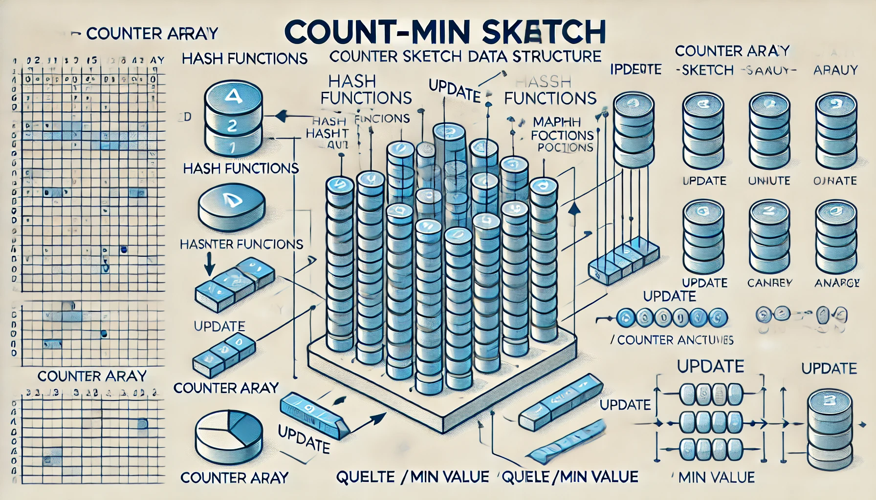 **Count-min Sketch(CMS)**는 여러 개의 해시 함수와 이중 배열 구조를 활용해 각 항목의 빈도를 추정하는 구조입니다. 오류가 허용되는 대신, 메모리 효율과 속도를 극대화한 것이 특징입니다.