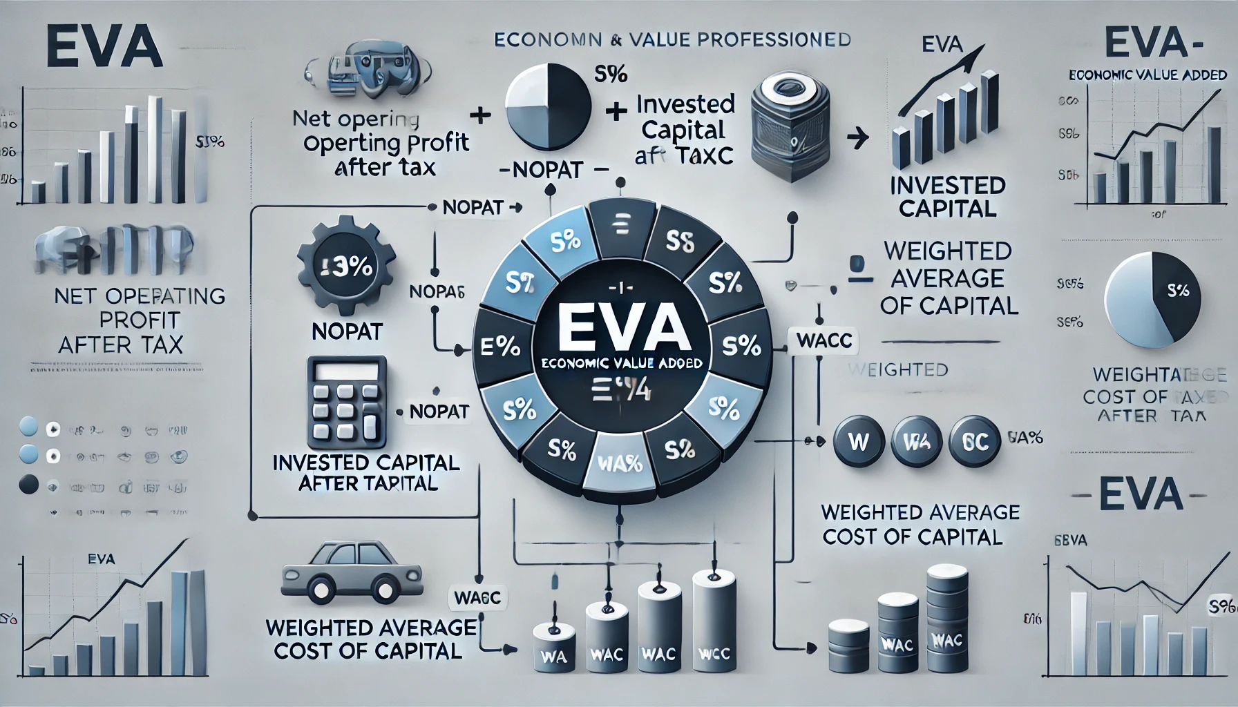 EVA는 순영업이익(NOPAT: Net Operating Profit After Tax)에서 자본비용(Capital Cost)을 뺀 금액으로, 기업이 자본을 얼마나 효율적으로 활용했는지를 나타냅니다. 이는 단순한 회계적 수익이 아닌 경제적 가치 창출을 기준으로 기업의 실질적인 성과를 평가하는 데 중점을 둡니다.