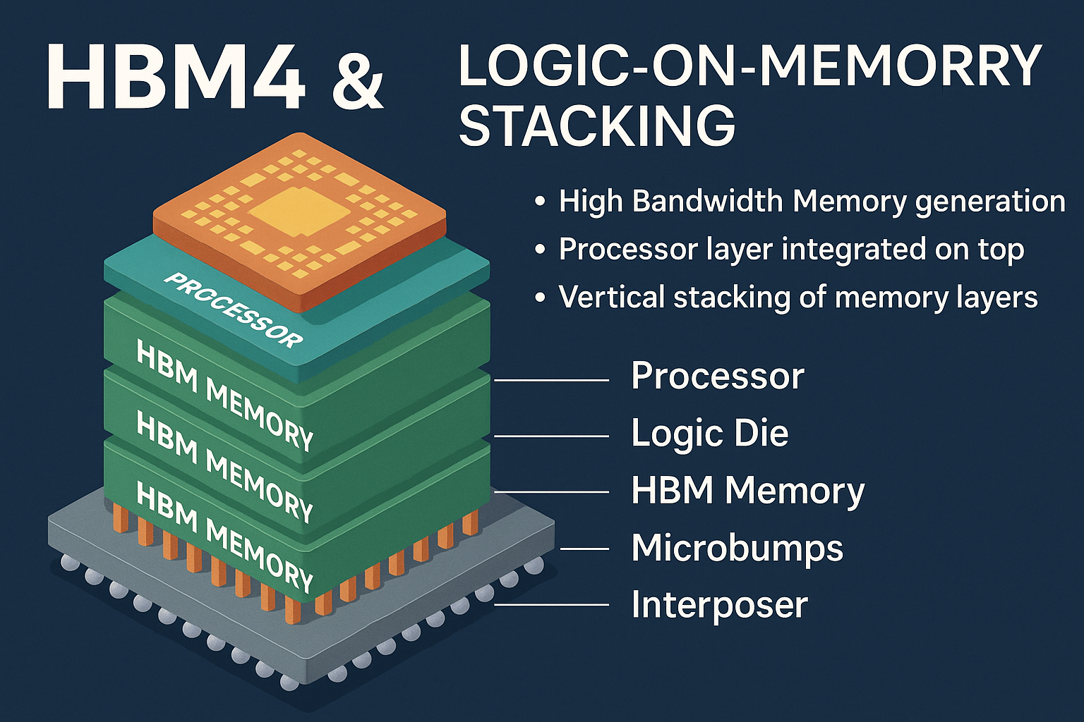 HBM4(High Bandwidth Memory 4)는 차세대 고대역폭 메모리로, 초고속 연산 성능이 요구되는 AI, HPC, 그래픽 환경을 위해 설계되었습니다. 여기에 Logic-on-Memory Stacking 기술을 접목하면, 로직 다이(Processor, Controller)를 메모리 스택 위에 수직 적층함으로써 데이터 병목을 줄이고, 면적 효율성과 전력 효율을 동시에 극대화할 수 있습니다.