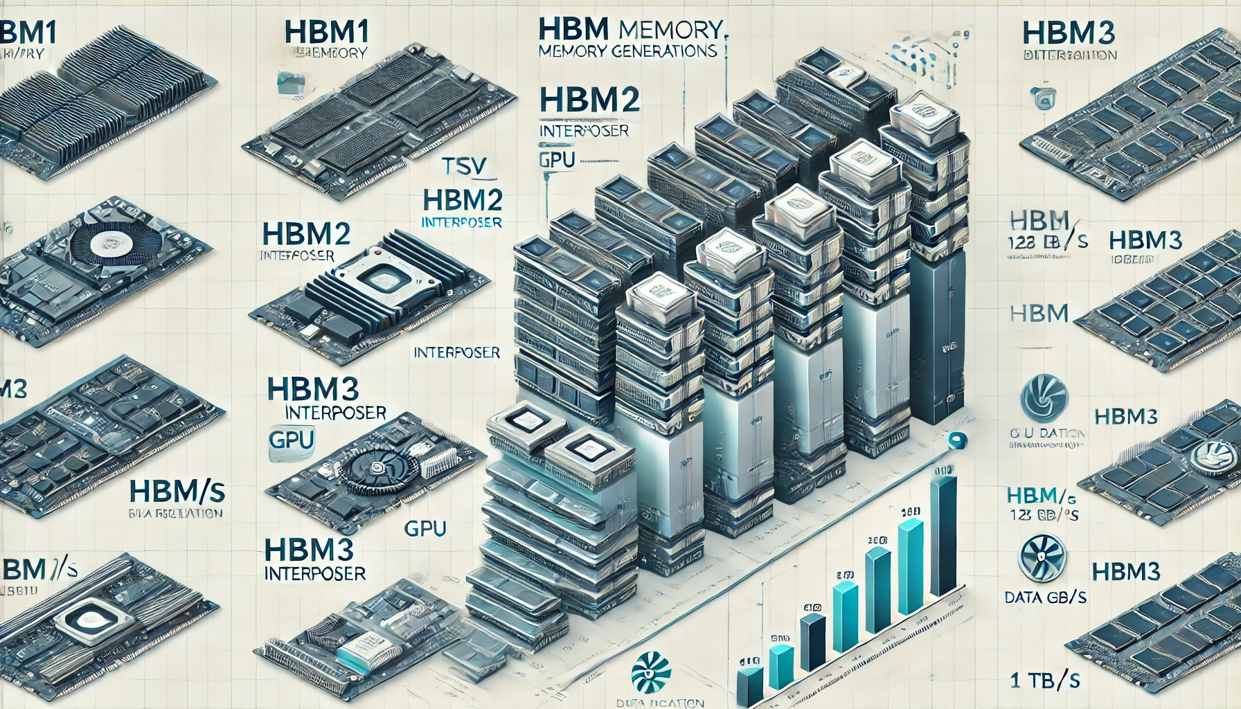HBM(High Bandwidth Memory) 시리즈는 TSV(Through-Silicon Via) 기반 3D 스택 DRAM 기술로, 고대역폭과 낮은 지연 시간, 높은 전력 효율을 특징으로 합니다. HBM1부터 최신 HBM3E까지, 세대별 발전을 거듭하며 AI, HPC, 그래픽, 네트워크 장비 등 다양한 고성능 시스템에 적용되고 있습니다. 본 글에서는 각 HBM 세대의 특징, 기술 변화, 활용 환경을 정리합니다.