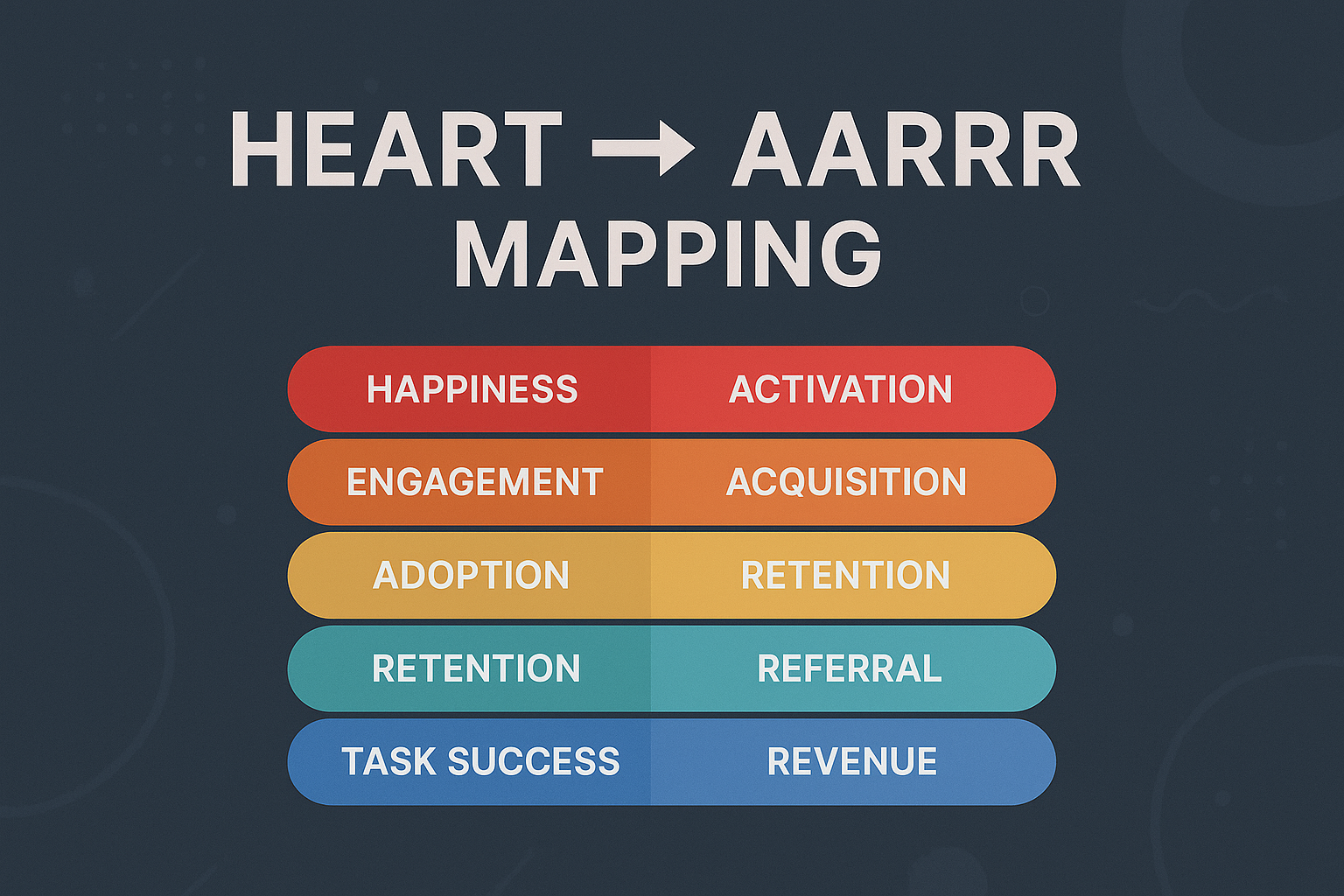 HEART → AARRR 매핑은 제품 경험과 성장 전략 간 단절을 연결하는 강력한 방법론입니다. UX와 그로스가 독립된 목표가 아닌 상호 작용하는 목표로 통합되어야 하는 시대에, 이 매핑은 데이터 기반 제품 운영의 필수 프레임워크로 자리매김하고 있습니다.