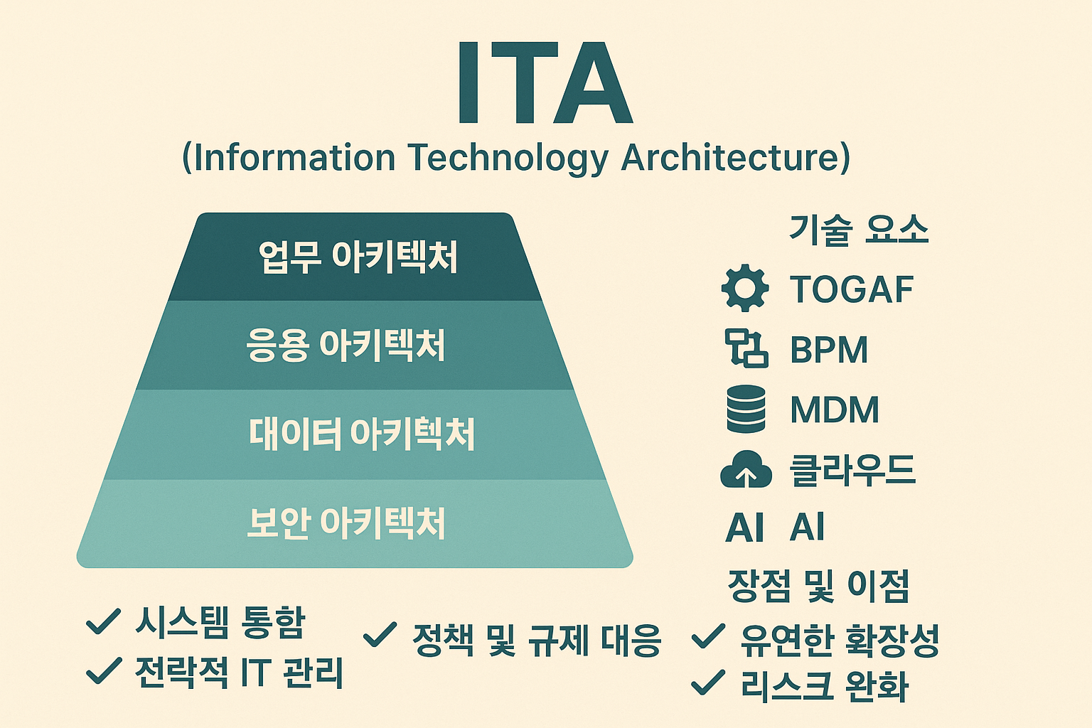 ITA는 정보기술 요소들을 비즈니스 전략과 정렬하여 설계, 개발, 운영 전반을 통합적으로 관리하는 아키텍처로, 구성요소 간의 상호작용과 기준을 명확히 하여 일관성 있고 유연한 IT 환경을 구축하는 것을 목적으로 한다.