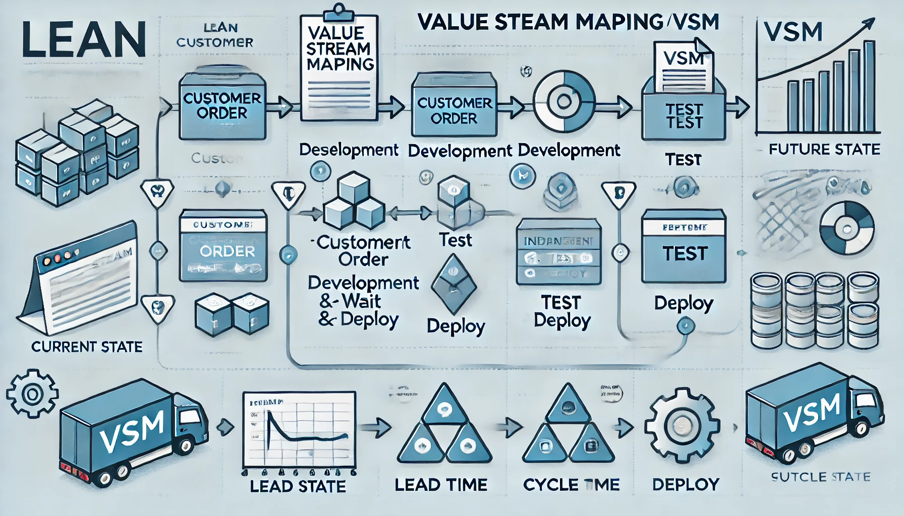 Lean Value Stream Mapping(VSM)은 린(Lean) 사고방식의 핵심 도구로, 제품 또는 서비스가 고객에게 전달되기까지의 전체 흐름(Flow)을 시각화하고 분석하여 낭비 요소를 식별하고 개선하기 위한 방법입니다. 제조업에서 시작되어 현재는 소프트웨어 개발, DevOps, 서비스 운영, 병원 등 다양한 산업으로 확장되며, 프로세스 최적화 및 디지털 전환 전략에도 필수 요소로 활용되고 있습니다.