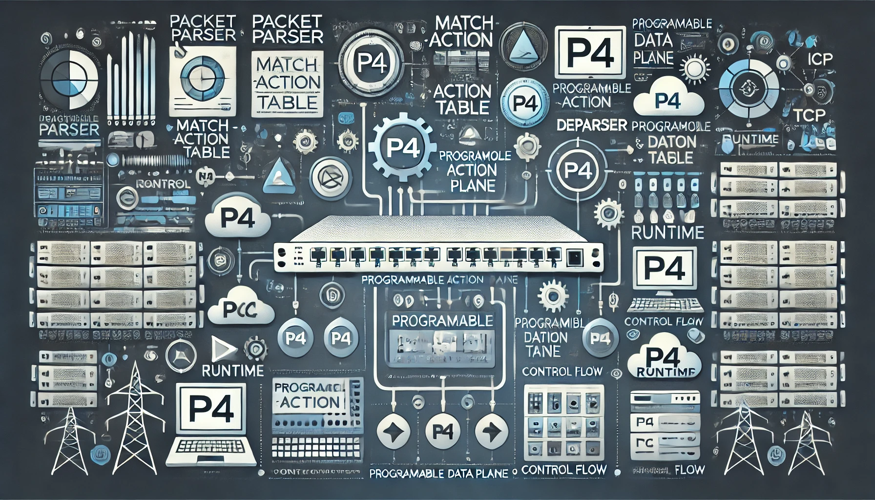 이러한 요소들은 P4 언어로 기술되며, 컴파일되어 타겟 플랫폼에서 실행됩니다.