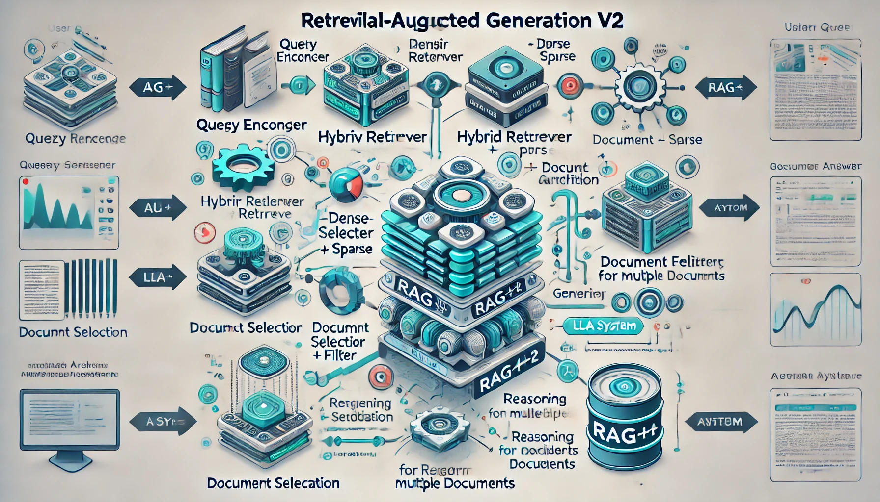RAG++는 질문 → 검색 → 요약/생성의 세 단계 파이프라인을 다음과 같이 강화합니다: