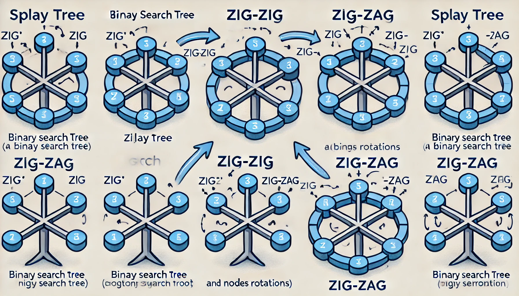 Splay Tree의 핵심은 Splay 연산이며, 이는 트리 구조를 재조정하는 세 가지 회전 연산으로 구성됩니다.