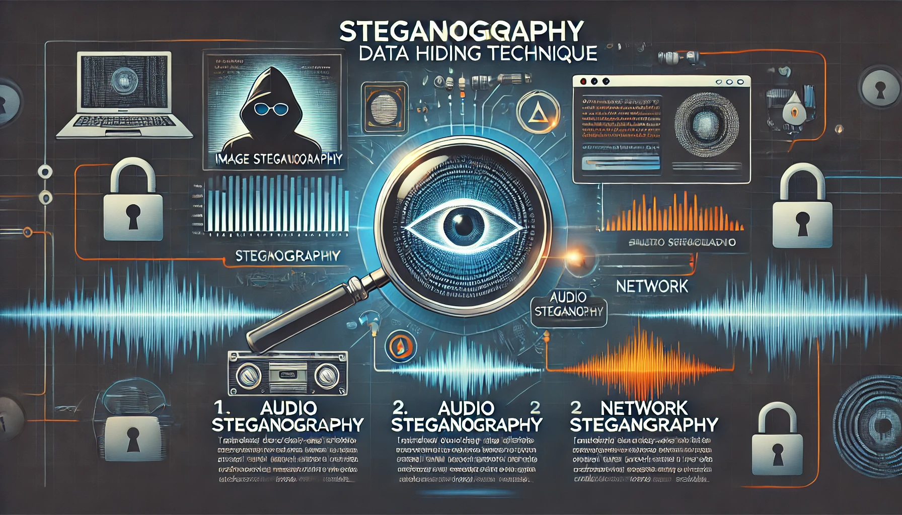 | 오디오 기반(Audio Steganography) | 오디오 파일 내 특정 주파수 대역에 데이터를 숨김 | MP3, WAV 파일 내 은닉 데이터 삽입 |