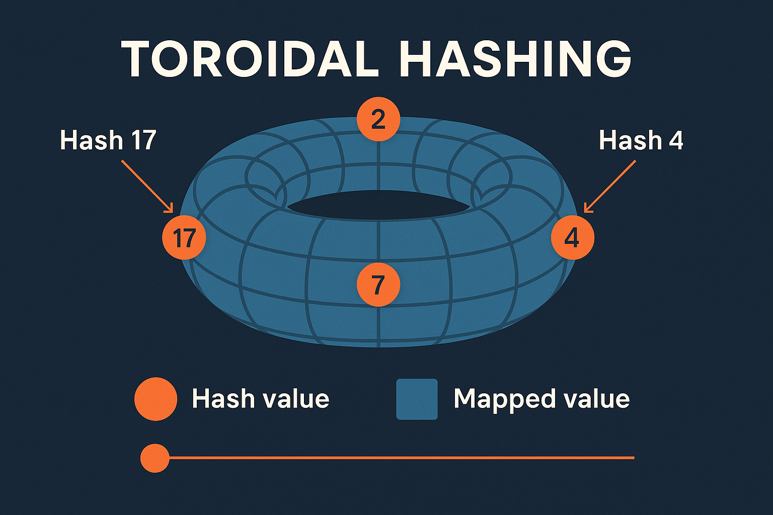 Toroidal Hashing은 키 값을 2차원 또는 다차원 해시 공간에 매핑하고, 각 차원은 **원형(circular)**으로 연결되어 있으며, 경계 없이 반대편과 이어지는 구조를 갖습니다. 예를 들어 2D 공간에서는 (x + 1, y), (x, y + 1)의 좌표가 경계를 넘어서면 반대편으로 wrap-around됩니다.