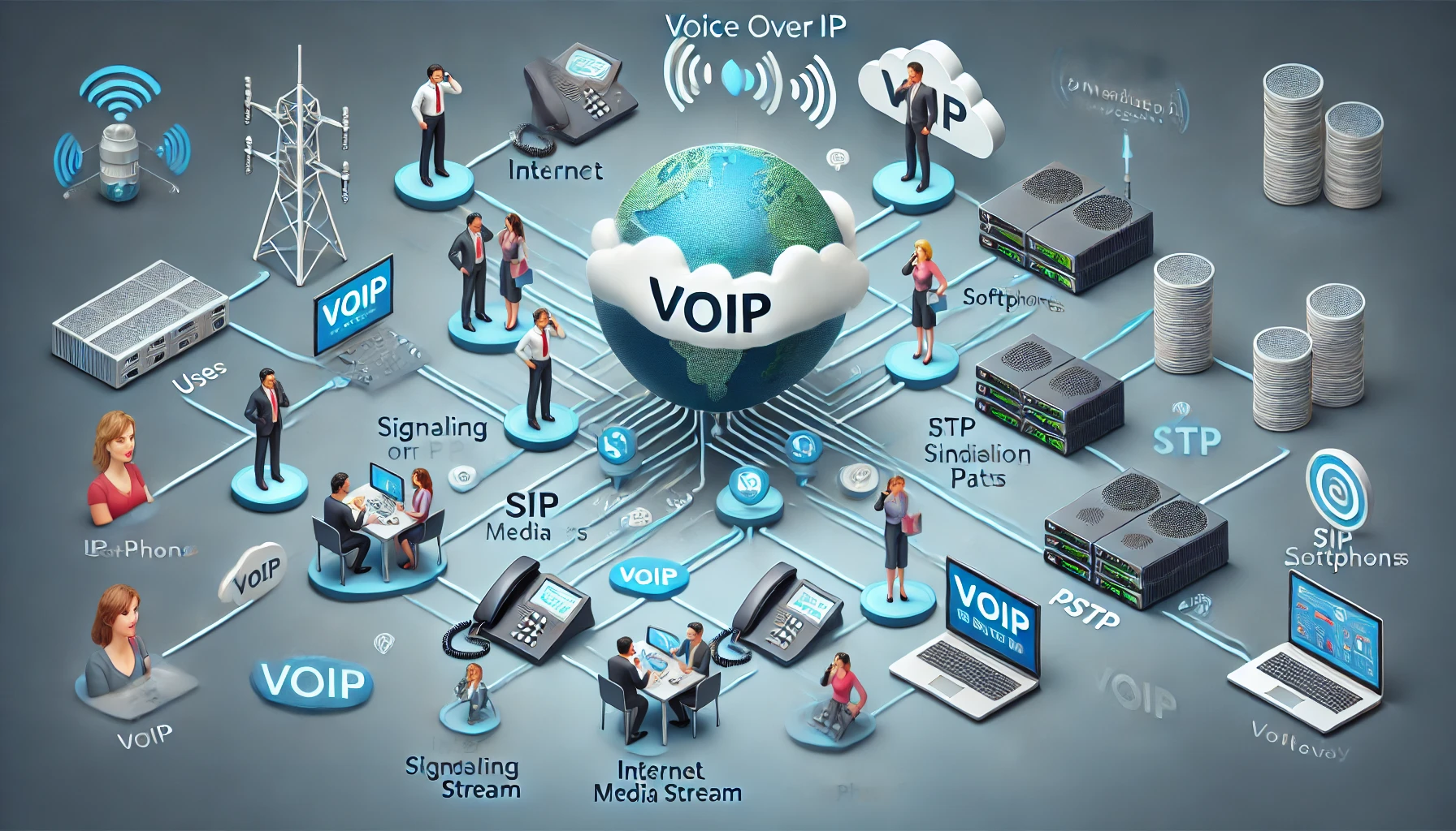 VoIP는 음성을 아날로그 신호에서 디지털 신호로 변환하여 IP 네트워크 상에서 전송하는 기술입니다. 실시간으로 데이터를 전송하기 위해 RTP(Real-time Transport Protocol)와 같은 프로토콜을 사용하며, 기존 음성 통신 방식보다 훨씬 유연하고 경제적입니다. VoIP는 Skype, Zoom, IP 전화기, 기업용 PBX 시스템 등 다양한 형태로 구현됩니다.