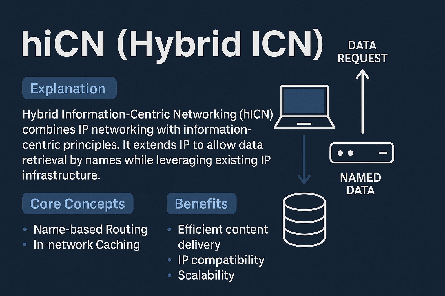 hICN(Hybrid Information-Centric Networking)은 전통적인 IP 기반 네트워크에서 이름 기반 통신(Name-Based Networking)의 장점을 통합하여, 콘텐츠 중심 데이터 전달과 기존 IP 호환성을 동시에 제공하는 하이브리드 네트워킹 아키텍처입니다. Cisco에서 주도적으로 개발되었으며, ICN(Information-Centric Networking)의 핵심 아이디어인 ‘데이터 이름’을 기반으로 한 전송 방식을 기존 IPv6 및 TCP/IP 인프라 위에서 실현함으로써, 현실적인 도입이 가능한 ICN 솔루션으로 주목받고 있습니다.