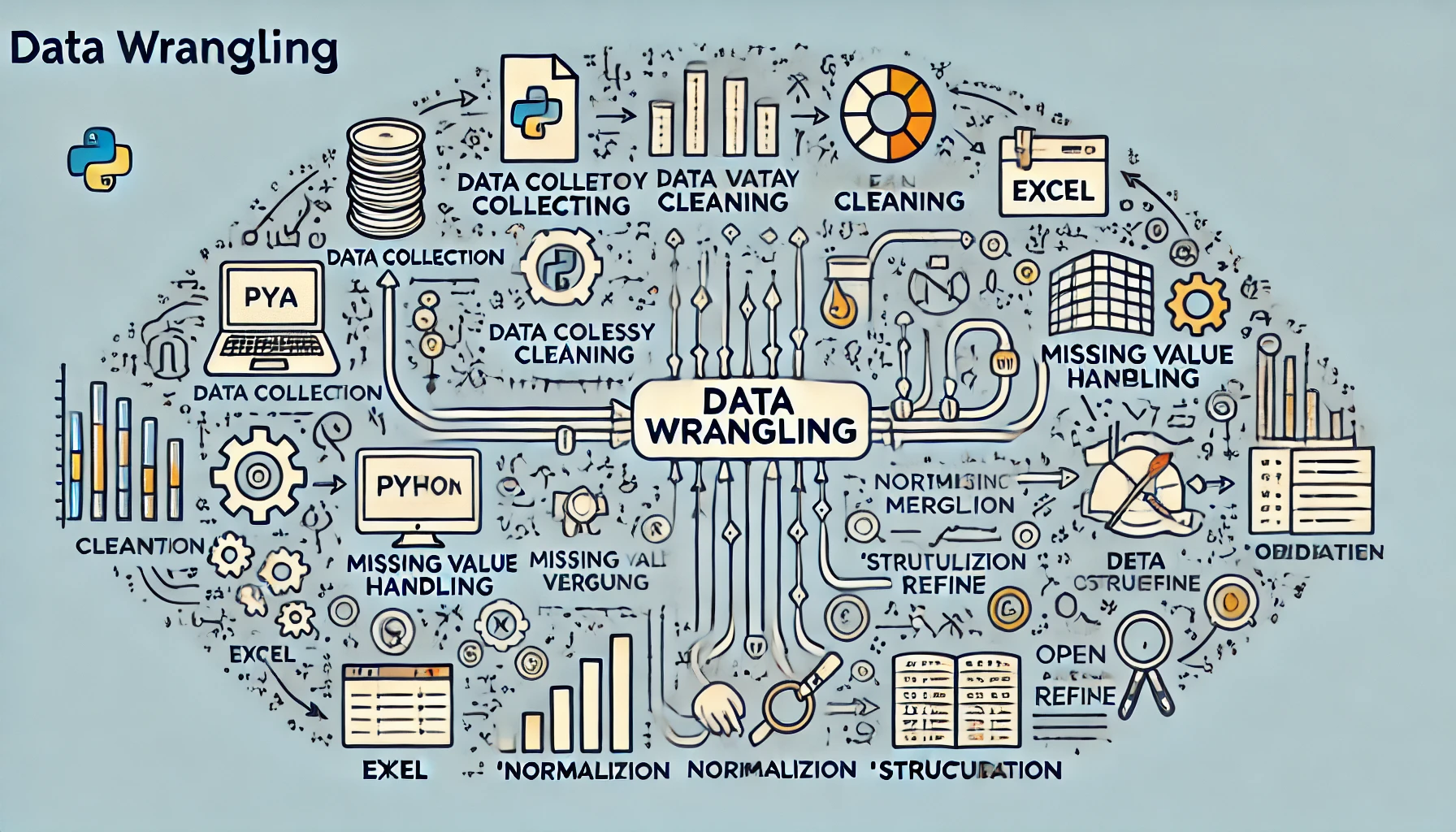 데이터 랭글링(Data Wrangling)은 분석, 머신러닝, 시각화 등의 목적에 맞게 원시 데이터를 정제하고 구조화하는 일련의 전처리 과정을 의미합니다. 종종 '데이터 머시징(Data Munging)'이라고도 불리며, 실제 데이터 분석에서 가장 많은 시간을 차지하는 단계로 알려져 있습니다. 품질 좋은 분석 결과와 AI 모델 성능 확보를 위해 신뢰할 수 있는 데이터 준비 과정으로 필수적인 기술입니다.