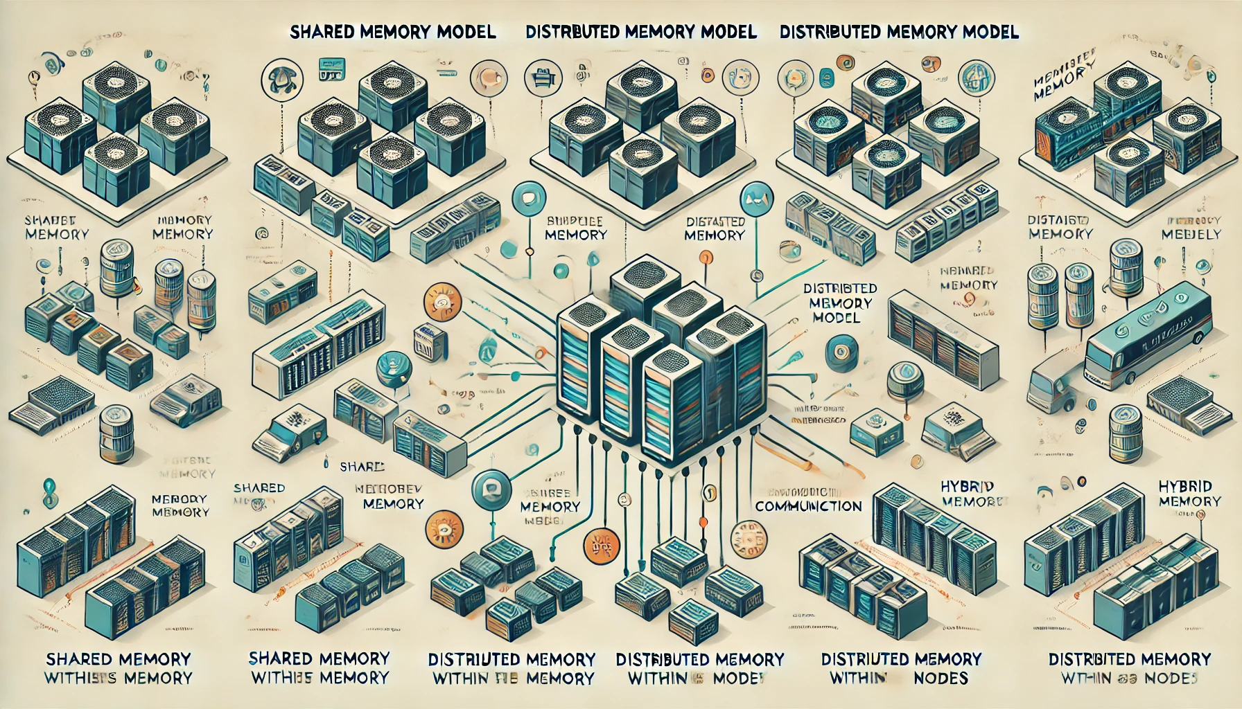 메모리 공유 방식은 여러 처리 장치가 메모리를 공유하는 구조인지, 또는 각자 독립적인 메모리를 가지며 메시지를 통해 통신하는지에 따라 크게 **공유 메모리 모델(Shared Memory Model)**과 **분산 메모리 모델(Distributed Memory Model)**로 나뉘며, 최근에는 **하이브리드 모델(Hybrid Memory Model)**이 널리 사용되고 있습니다.