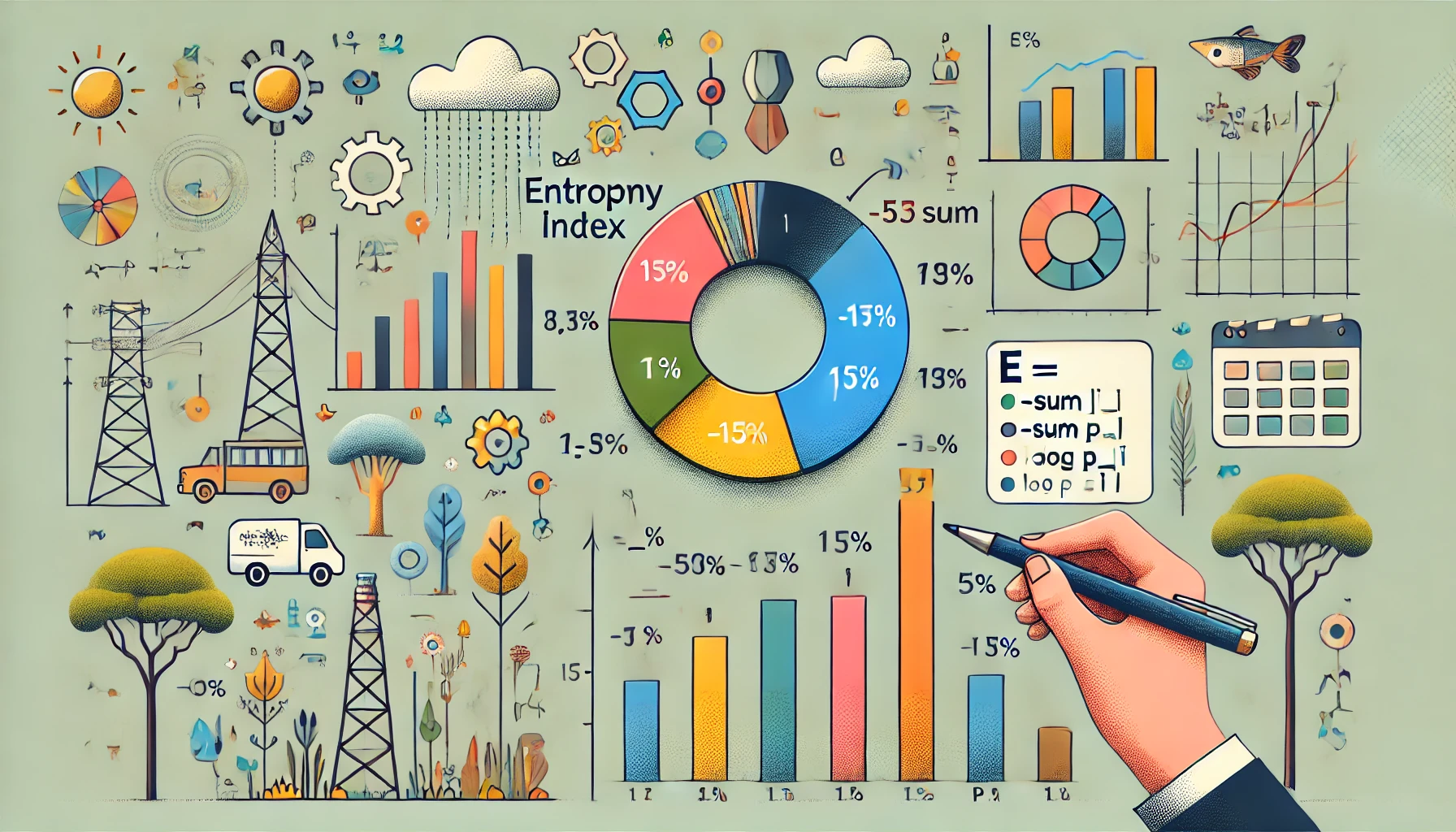 엔트로피 지수(Entropy Index)는 집단 내 구성의 다양성과 균형 정도를 측정하는 지표로, 경제학, 사회학, 도시학, 생태학 등 다양한 분야에서 사용됩니다. 정보 이론에서 유래한 개념으로, 특정 항목이 얼마나 다양하게 분포되어 있는지를 0~1 또는 0~ln(n) 사이의 수치로 정량화합니다. 균일할수록 엔트로피 값이 높고, 특정 항목에 치우칠수록 낮아집니다.