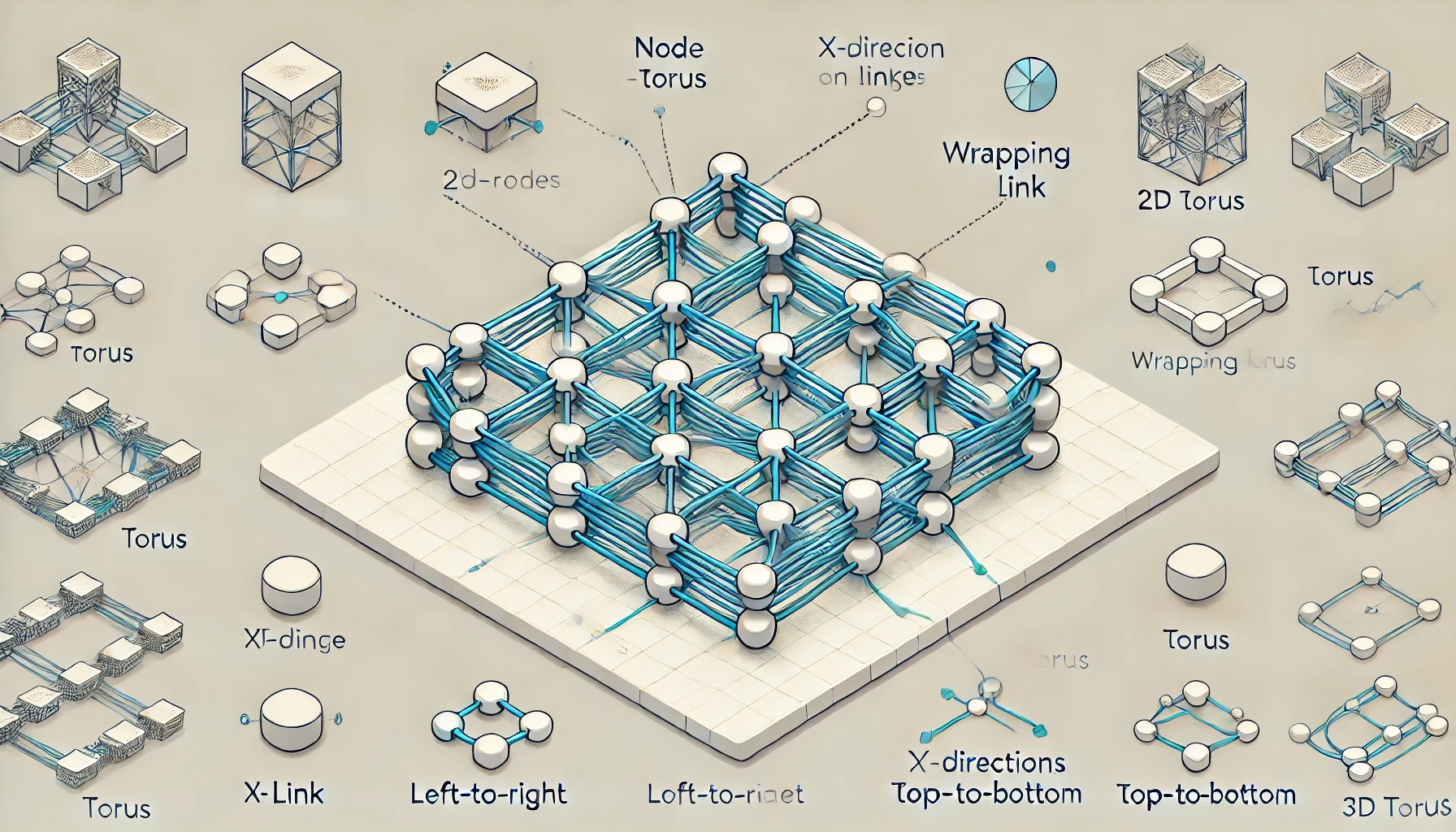 토러스 구조는 전통적인 메시 구조에 **양 끝 노드를 서로 연결하는 래핑 링크(wrapping link)**를 추가함으로써 네트워크를 폐쇄된 형태로 확장한 것입니다. 2D 토러스는 가로·세로 방향에서 각각의 가장자리 노드가 연결되며, 3D 토러스는 여기에 깊이 방향까지 추가되어 입체적인 연결망을 구성합니다.