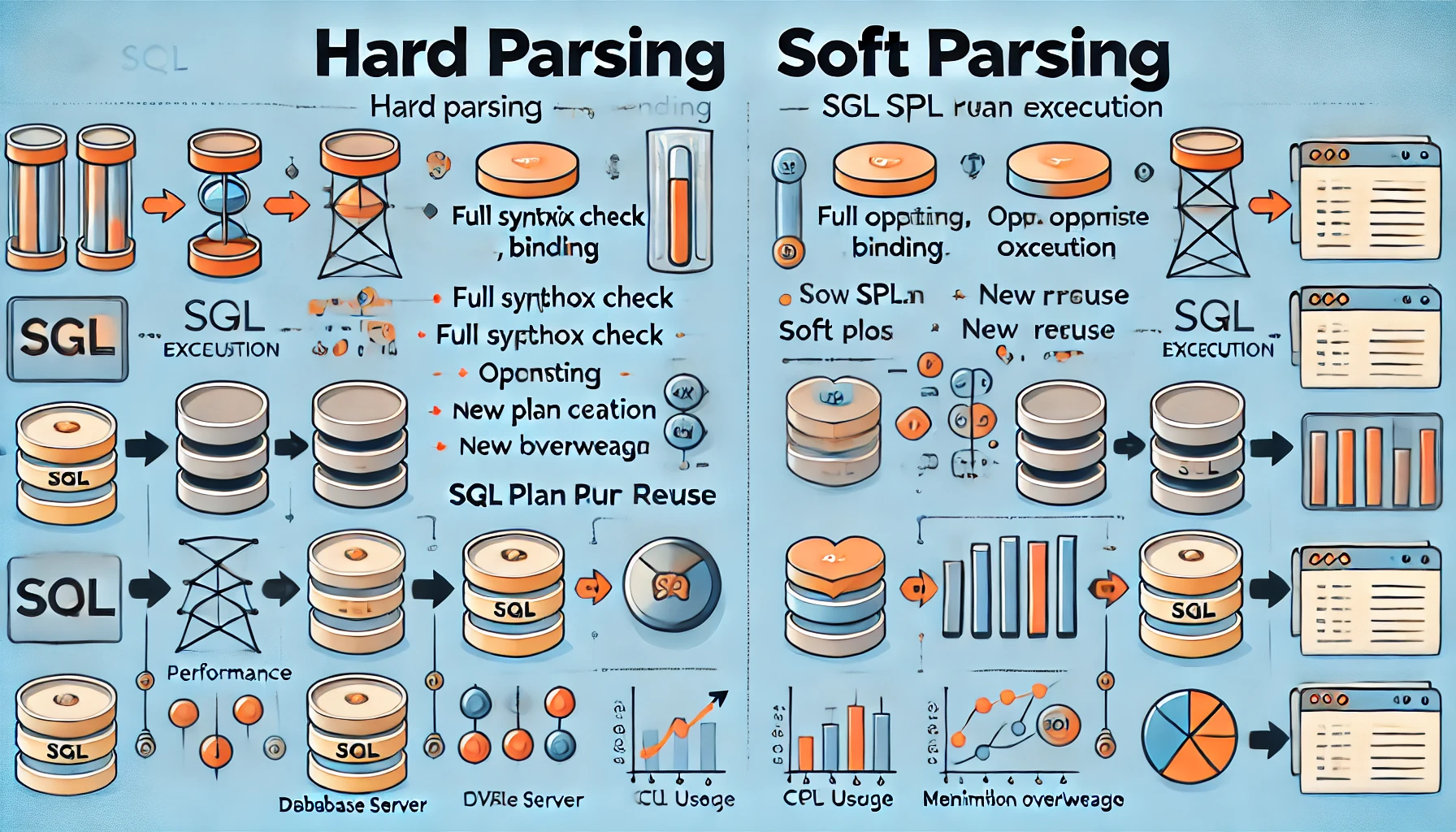 - 하드파싱은 부하가 크고 느리며, 소프트파싱은 빠르고 효율적입니다.