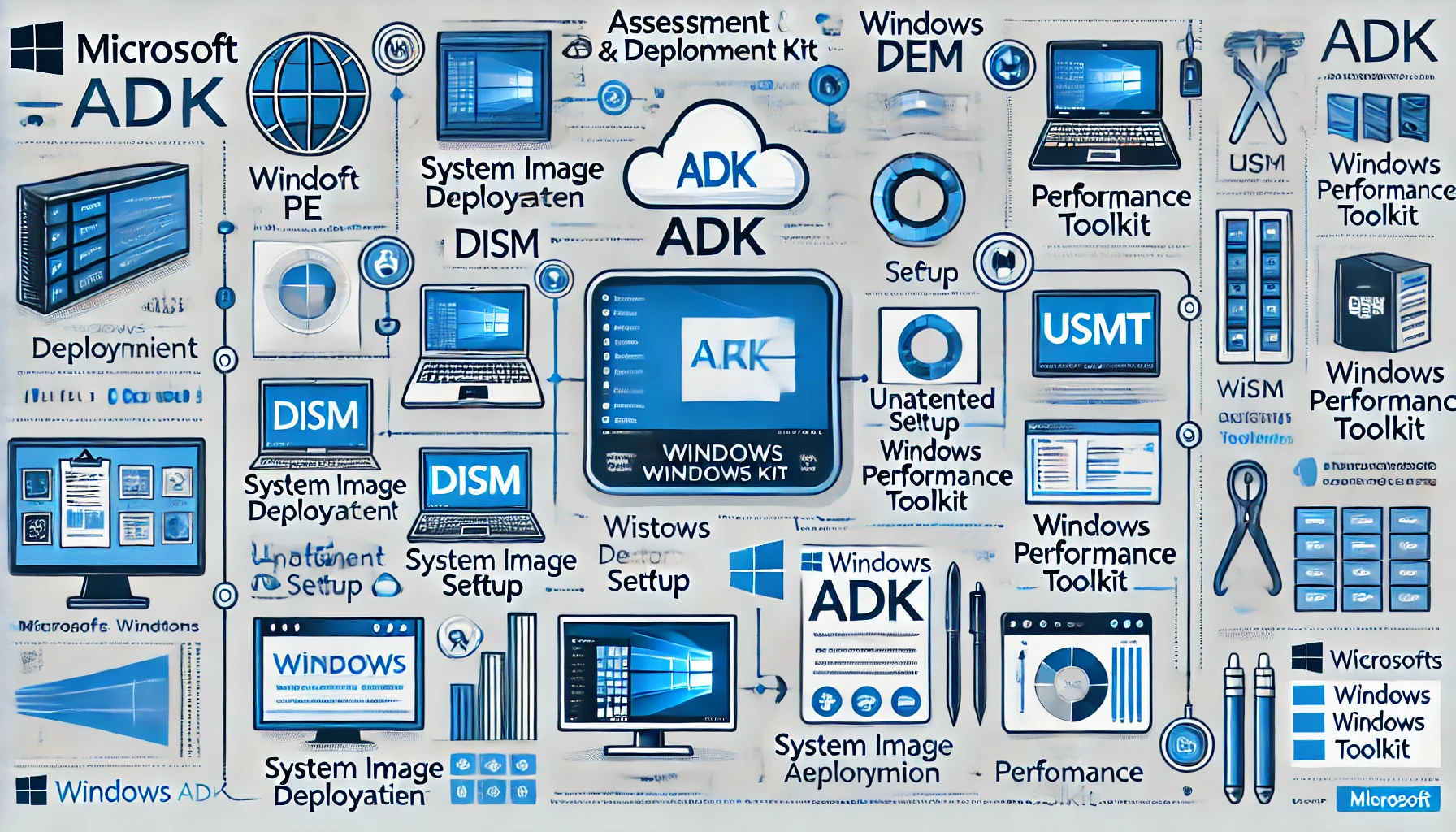ADK(Assessment and Deployment Kit)는 Microsoft에서 제공하는 윈도우 운영체제 배포 및 평가 도구 모음입니다. IT 관리자와 시스템 통합업체(SI), 엔터프라이즈 환경에서 윈도우 OS를 대규모로 설치하고 성능을 테스트하는 데 유용한 기능들을 포함하고 있어, 윈도우 환경 구축 및 최적화에 필수적인 도구입니다.