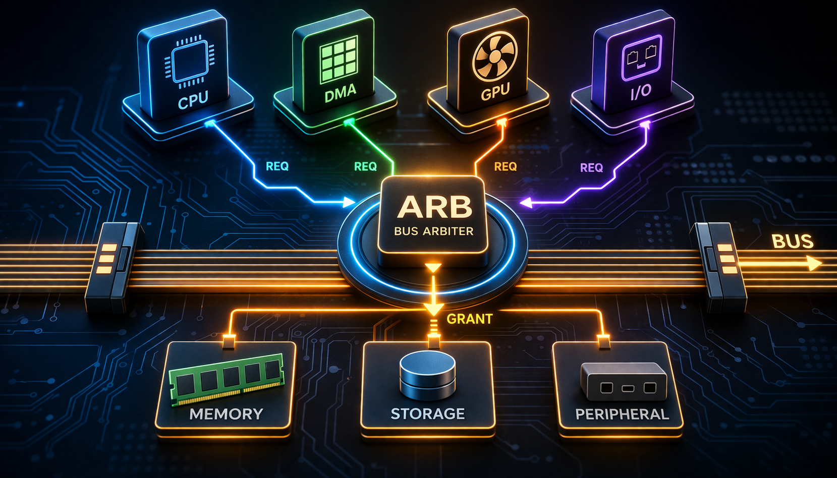 버스 중재(Bus Arbitration)는 여러 마스터 장치(CPU, DMA, GPU 등)가 하나의 시스템 버스를 공유할 때, 어떤 장치가 언제 버스를 사용할지 결정하는 메커니즘이다. 컴퓨터 아키텍처에서 데이터 전송 충돌을 방지하고 시스템 성능을 최적화하기 위해 필수적인 기술이다. 특히 멀티코어 및 고성능 시스템에서 공정성과 지연(latency) 최소화가 중요한 설계 요소로 작용한다.