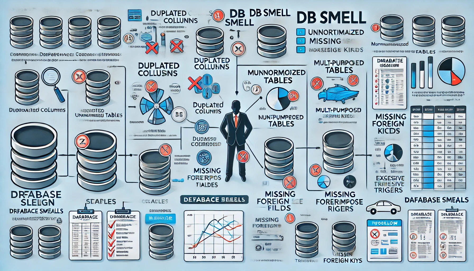 'Code Smell'처럼 'DB Smell'은 데이터베이스에서 유지보수성과 확장성을 해치는 구조적 결함 또는 나쁜 설계 습관을 의미합니다. 즉시 오류를 발생시키진 않지만, 장기적으로는 성능 저하, 비즈니스 로직 중복, 데이터 품질 저하 등의 문제를 유발합니다. 이 글에서는 대표적인 DB Smell의 유형, 원인, 진단 방법, 개선 전략을 실무 중심으로 소개합니다.