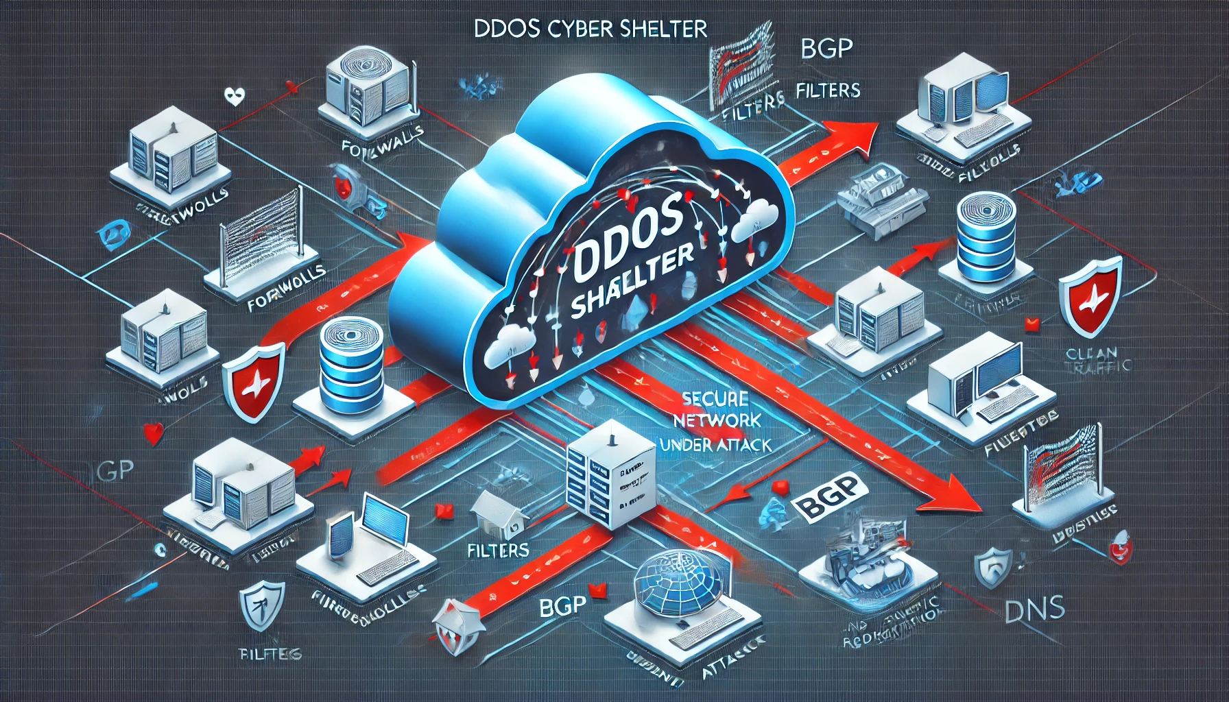 DDoS 사이버 대피소(DDoS Cyber Shelter)는 대규모 DDoS(Distributed Denial of Service) 공격으로부터 기업의 핵심 서버 및 네트워크 인프라를 보호하기 위해 설계된 전용 보호 인프라 또는 클라우드 기반 방어 시스템을 의미한다. 공격 발생 시, 주요 트래픽을 사이버 대피소로 우회시켜 공격 트래픽을 흡수하고 정상 요청만 필터링하여 본 시스템으로 전달함으로써 가용성과 서비스 연속성을 보장한다.