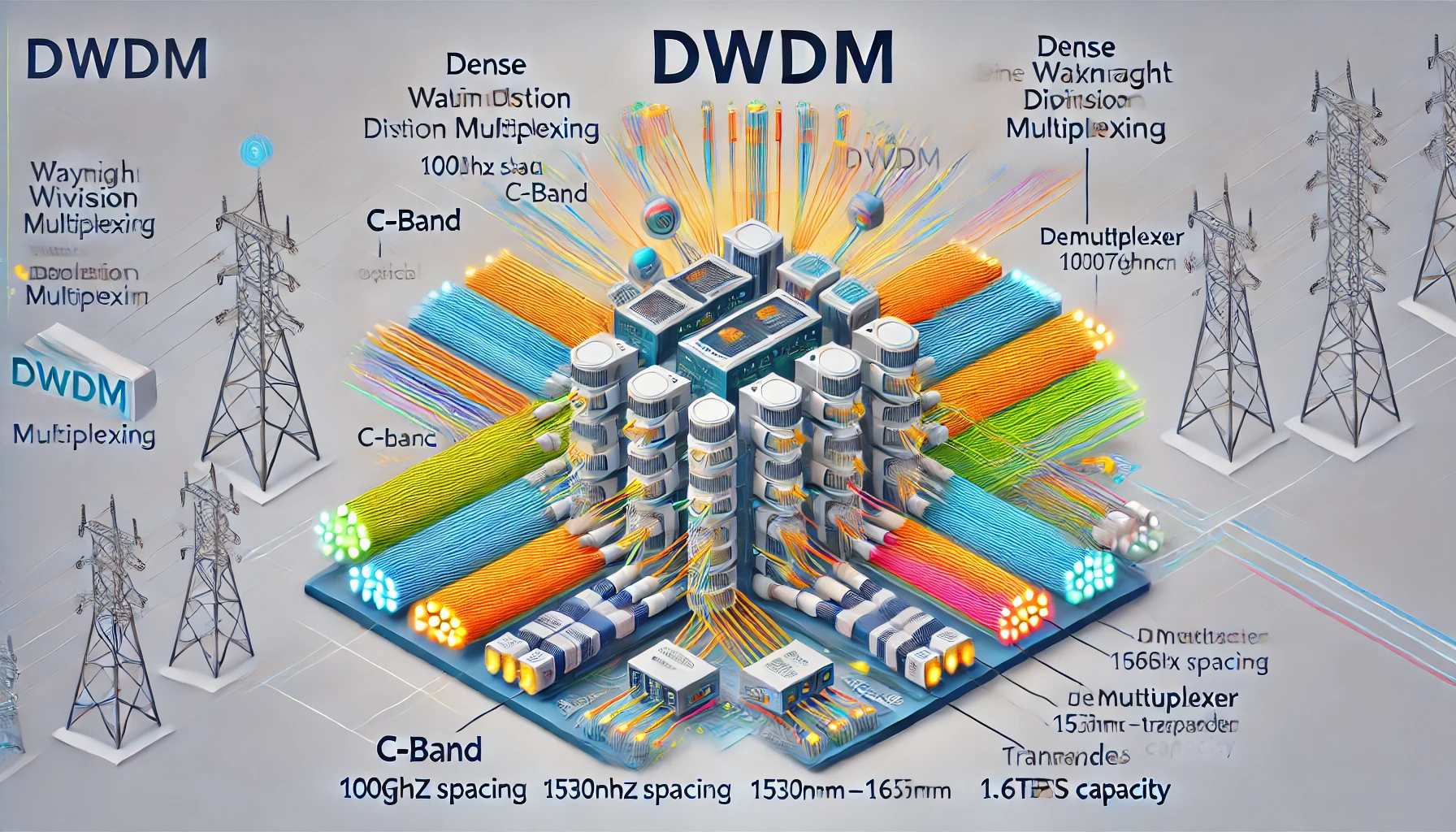 DWDM은 WDM의 고도화된 형태로, 파장 간 간격을 좁혀(보통 0.8nm 또는 100GHz 이하) 더 많은 채널을 수용하는 다중화 방식이다. 광 스펙트럼의 특정 범위(C-band 또는 L-band)를 활용해 수십에서 수백 개의 파장을 동시에 전송할 수 있다. 이는 기존 인프라를 유지하면서도 대역폭을 수십 배 이상 확장할 수 있는 효과적인 방법이다.