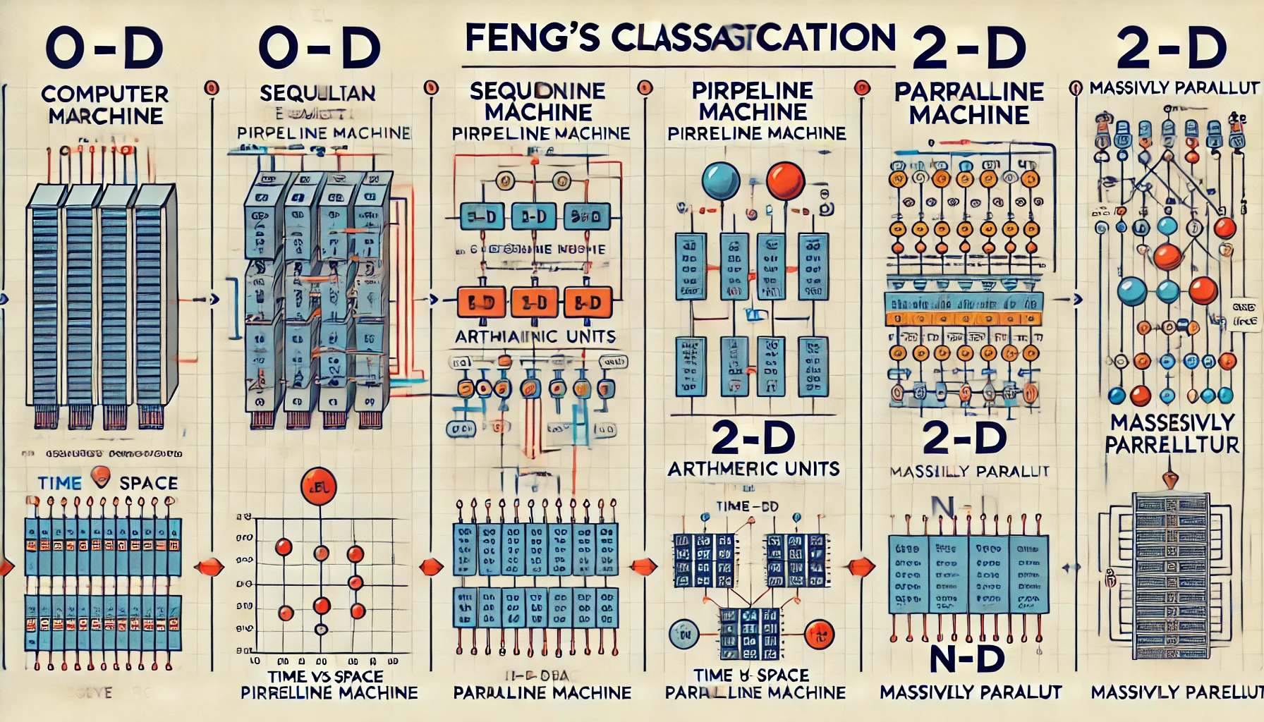 Feng의 분류는 컴퓨터 구조를 "연산 단위(Arithmetic Units)"와 "명령어 실행 타임슬롯" 기준으로 공간-시간적 명령어 흐름 패턴에 따라 4가지로 구분합니다. 이를 통해 컴퓨터가 주어진 시간과 자원에서 얼마나 병렬적으로 명령어를 실행할 수 있는지 측정할 수 있으며, **기계 명령어 실행율(Machine Instruction Rate)**을 정의하는 데도 활용됩니다.