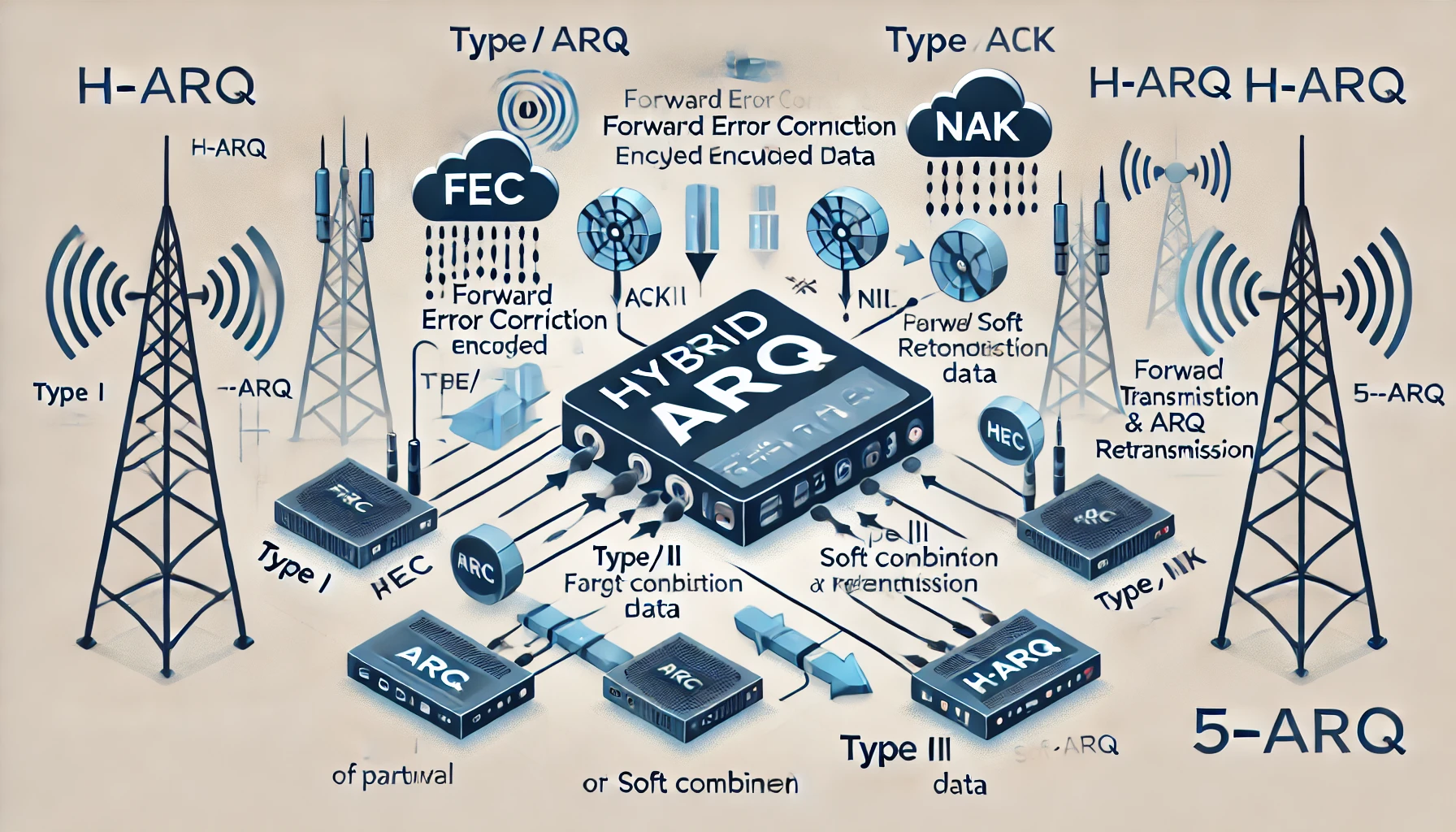 H-ARQ(Hybrid Automatic Repeat reQuest)는 오류 정정 기술(FEC: Forward Error Correction)과 재전송 요청 기술(ARQ: Automatic Repeat reQuest)을 결합한 고신뢰 통신 기법입니다. 단순한 오류 검출 후 재전송이 아닌, 부분적으로 손상된 데이터도 복원할 수 있도록 하여 통신 효율성과 신뢰성을 동시에 강화합니다. LTE, 5G, 위성 통신 등 고속 고품질 네트워크에서 널리 사용됩니다.
