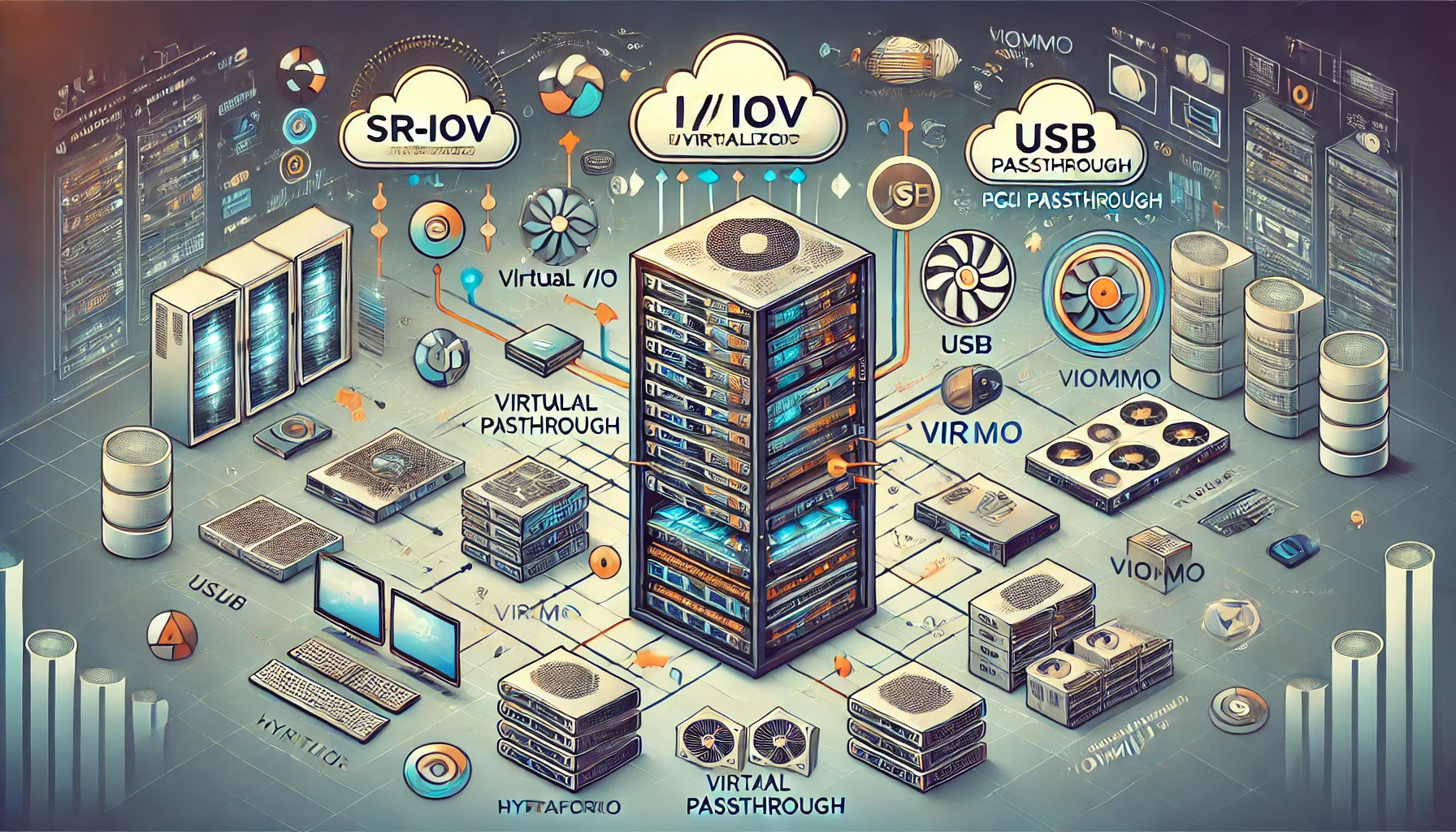 I/O 가상화(Input/Output Virtualization)은 가상 머신(VM) 또는 컨테이너 환경에서 물리적인 I/O 자원(스토리지, 네트워크, USB, GPU 등)을 효율적으로 공유하고 제어하기 위한 기술입니다. CPU, 메모리 가상화와 함께 I/O 가상화는 고성능 가상 인프라의 필수 요소로, 클라우드, 데이터센터, 고성능 컴퓨팅(HPC) 환경에서 널리 활용되고 있습니다.