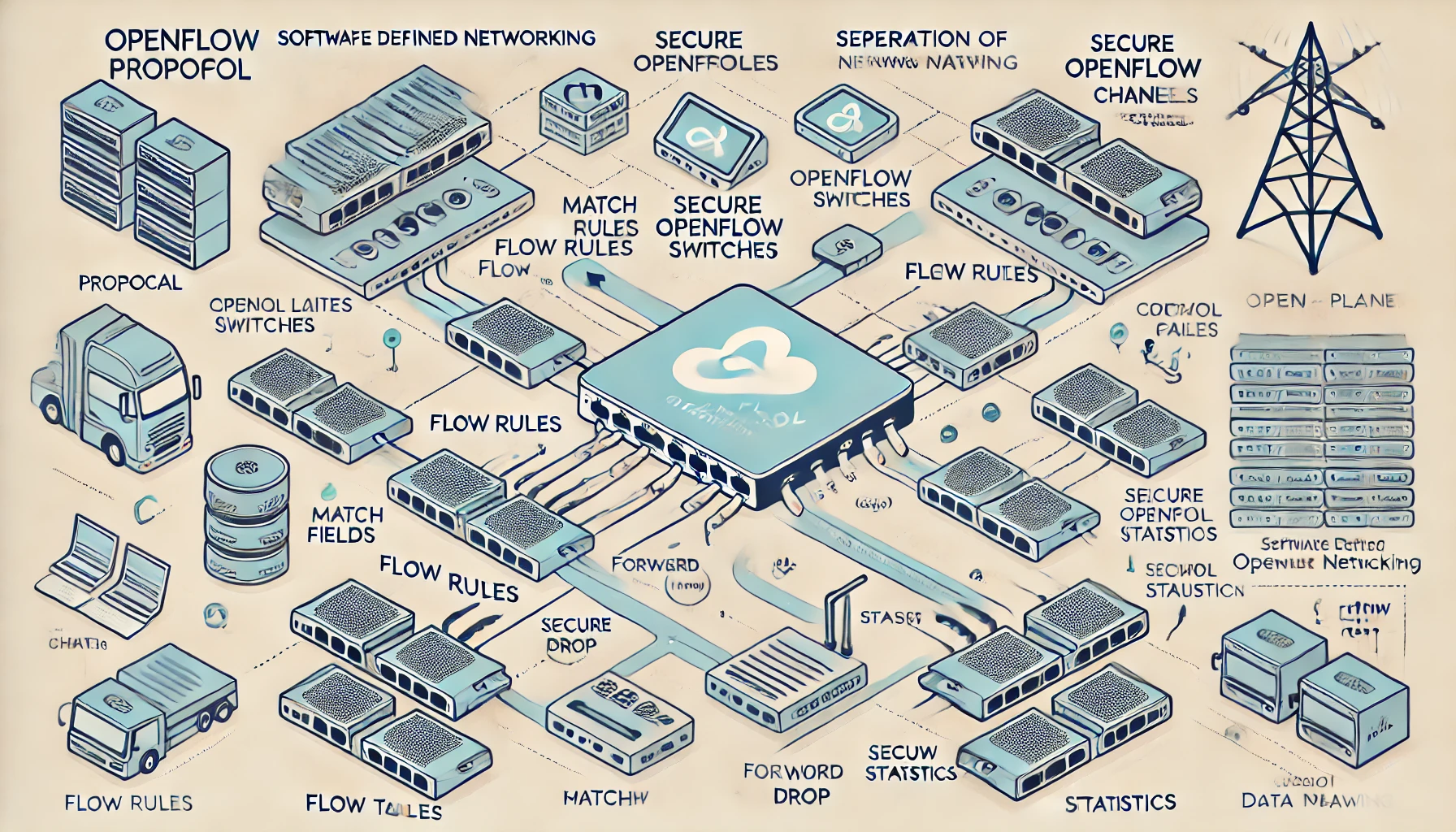 OpenFlow는 소프트웨어 정의 네트워크(SDN, Software Defined Networking)의 핵심 구성 요소로, 데이터 플레인과 제어 플레인을 분리하여 중앙 집중형 네트워크 제어를 가능하게 하는 개방형 통신 프로토콜입니다. 네트워크 장비의 제어를 중앙 컨트롤러로 이동시킴으로써 유연하고 프로그래머블한 네트워크 구성이 가능해졌으며, 데이터센터, 클라우드, 5G 백본 네트워크 등에 폭넓게 활용되고 있습니다.
