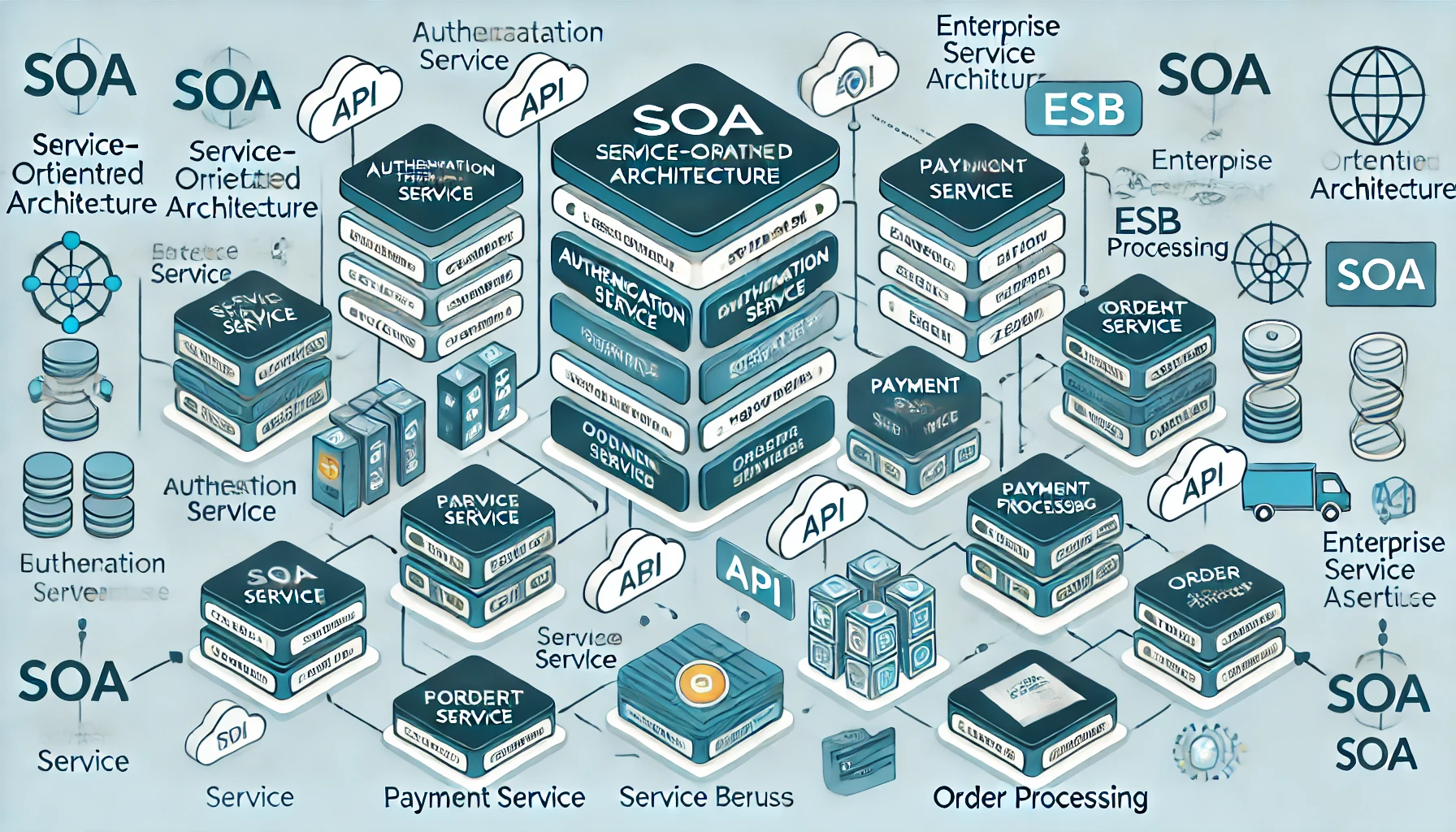 SOA(Service-Oriented Architecture)는 서비스(Service) 단위로 기능을 구성하여 서로 다른 애플리케이션이나 시스템이 독립적으로 동작하면서도 상호 작용할 수 있도록 설계된 아키텍처 모델이다. 서비스는 표준화된 인터페이스(API)를 통해 서로 연결되며, 필요에 따라 조합하여 새로운 비즈니스 프로세스를 구축할 수 있다.