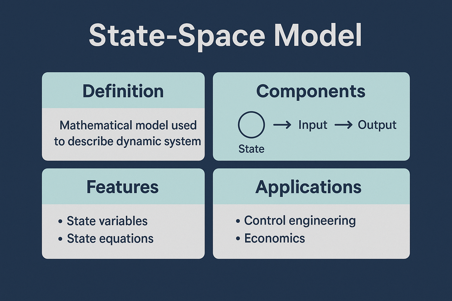 | 정의 | 시스템의 상태(state)와 그 변화에 따른 출력을 기술하는 수학 모델 |