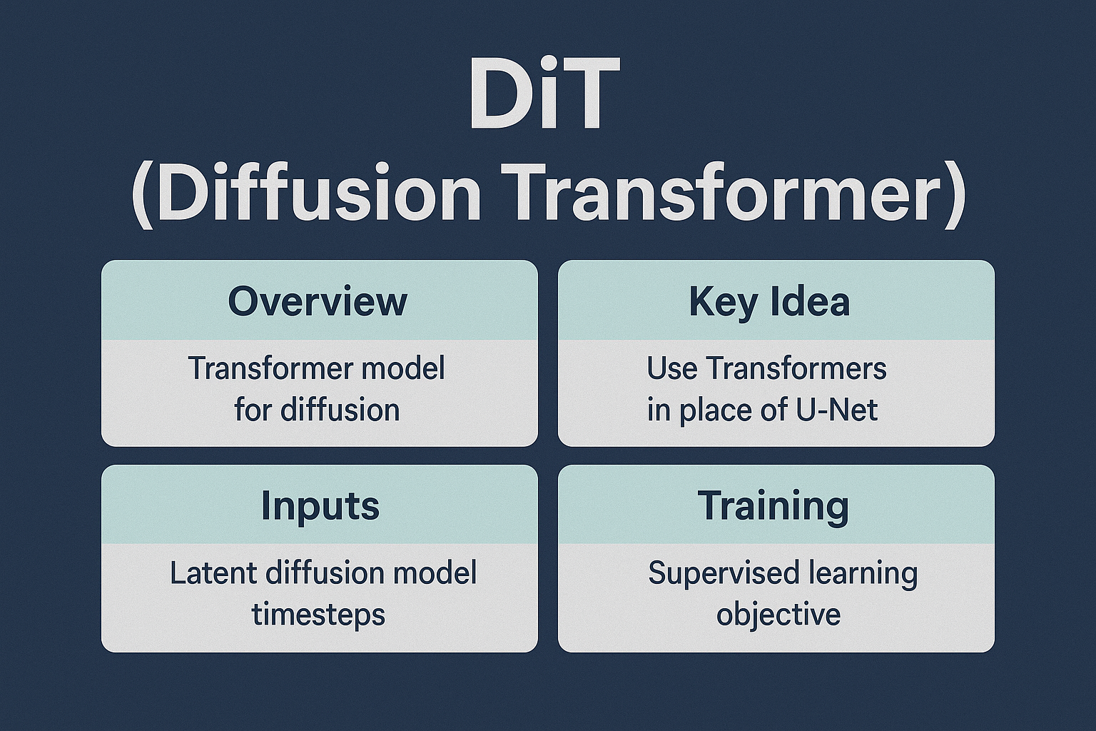 개요DiT(Diffusion Transformer)는 이미지 생성 디퓨전 모델에서 기존 U-Net 구조를 Transformer로 대체하여 성능과 확장성을 개선한 새로운 구조입니다. 특히, Transformer의 표현력과 스케일업 가능성을 활용해 고해상도 이미지 생성, 안정적 학습 등에서 차별화된 성능을 보여주며, DALL·E 3 및 Stable Diffusion 3와 같은 최신 생성형 AI 시스템에 영향을 주고 있습니다.1. 개념 및 정의 항목 내용 정의디퓨전 노이즈 제거 네트워크에 Transformer를 적용한 모델목표기존 CNN 기반 U-Net 대비 더 강력한 표현력 확보특징Latent 디퓨전 과정에서 Transformer가 노이즈 예측을 수행DiT는 Diffusion 과정에서 일정 단계(times..