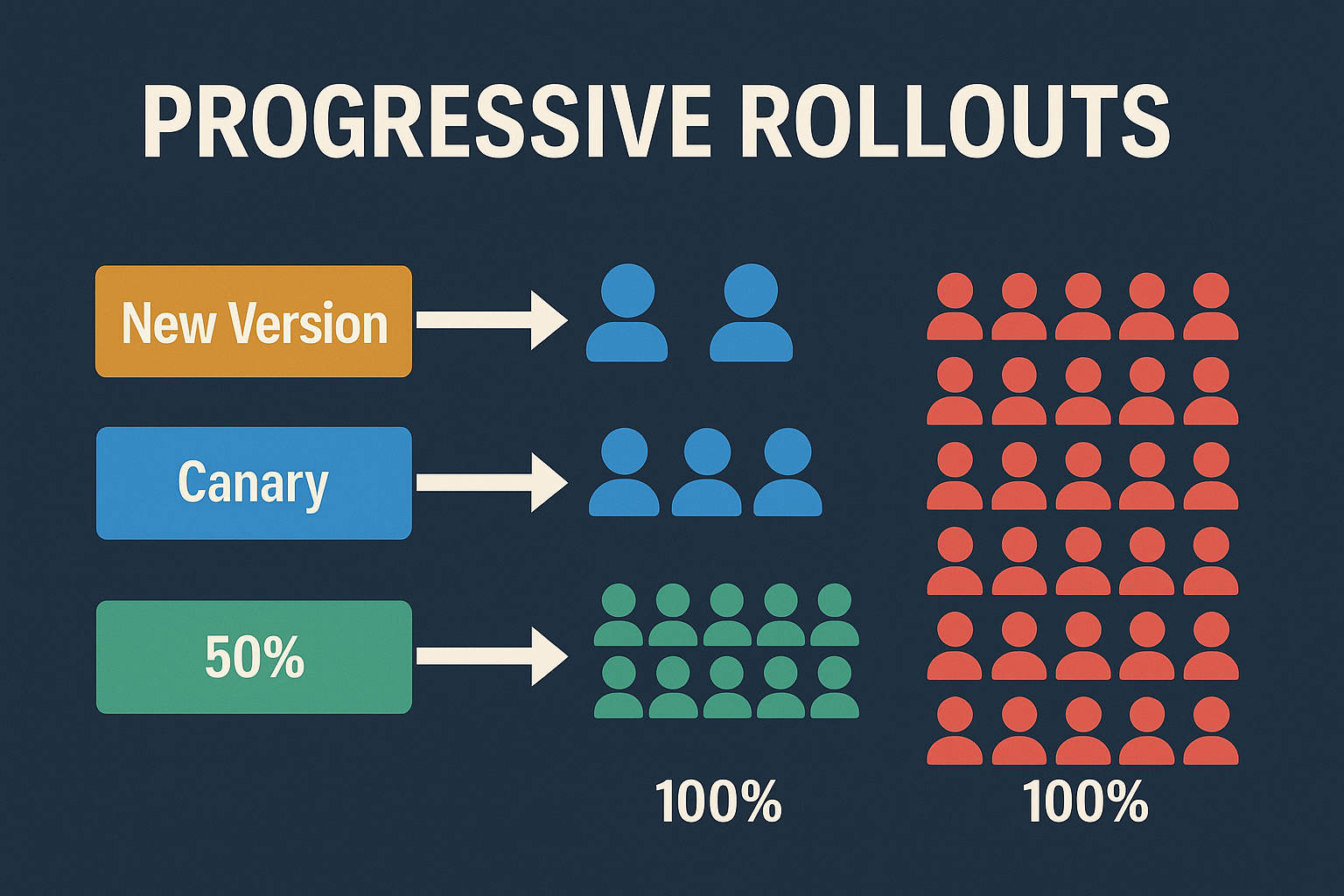 개요Progressive Delivery는 기능을 모든 사용자에게 일괄 배포하는 대신, 선별된 사용자 그룹에 점진적으로 배포하여 성능과 안정성을 검증하며 확장하는 소프트웨어 배포 전략입니다. 이는 Continuous Delivery의 확장 개념으로, 롤아웃 속도를 제어하고 리스크를 줄이며, 피드백 기반으로 배포 여부를 결정할 수 있는 현대적인 접근 방식입니다.1. 개념 및 정의Progressive Delivery는 피처 롤아웃을 소규모에서 시작해 점진적으로 전체 사용자에게 확대하며 배포의 신뢰성과 민첩성을 확보하는 전략입니다.기반 개념: Feature Flag + Traffic Shifting + Observability핵심 목표: 빠른 피드백 수집, 안전한 롤백, 실시간 모니터링주요 수단: Canary..